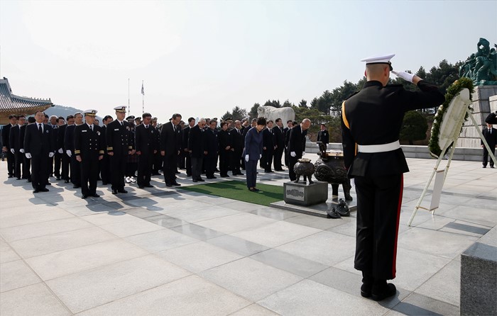 (서울=포커스뉴스) 박근혜 대통령이 25일 오전 국립대전현충원에서 열린 1회 서해수호의 날 기념식에 참석해 헌화 및 분향 후 묵념을 하고 있다. <사진제공=국가보훈처>