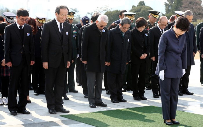(서울=포커스뉴스) 박근혜 대통령이 25일 오전 국립대전현충원에서 열린 1회 서해수호의 날 기념식에 참석해 헌화 및 분향 후 묵념을 하고 있다. <사진제공=국가보훈처>