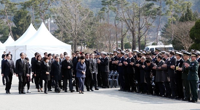 (서울=포커스뉴스) 박근혜 대통령이 25일 오전 국립대전현충원에서 열린 1회 서해수호의 날 기념식에 유족대표들과 함께 입장하고 있다. <사진제공=국가보훈처>