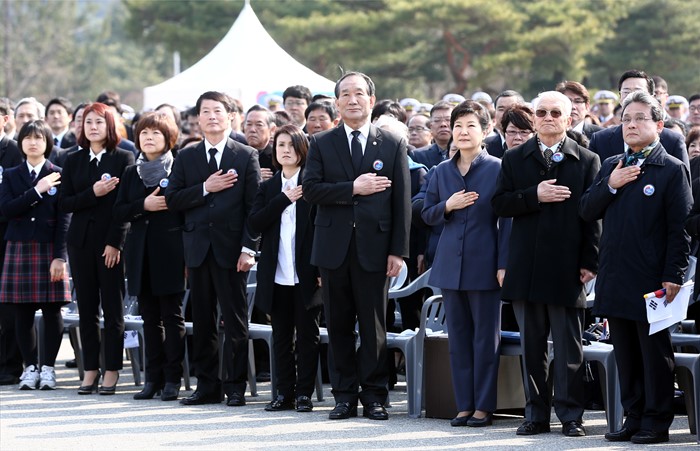 (서울=포커스뉴스) 박근혜 대통령이 25일 오전 국립대전현충원에서 열린 1회 서해수호의 날 기념식에 참석해 내빈들과 국기에 대한 경례를 하고 있다. <사진제공=국가보훈처>