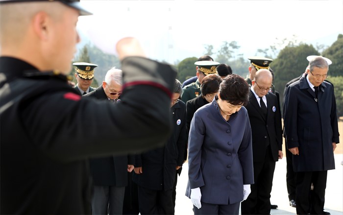 (서울=포커스뉴스) 박근혜 대통령이 25일 오전 국립대전현충원에서 열린 1회 서해수호의 날 기념식에 참석해 헌화 및 분향 후 묵념을 하고 있다. <사진제공=국가보훈처>
