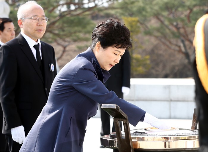 (서울=포커스뉴스) 박근혜 대통령이 25일 오전 국립대전현충원에서 열린 1회 서해수호의 날 기념식에 참석해 분향을 하고 있다. <사진제공=국가보훈처>
