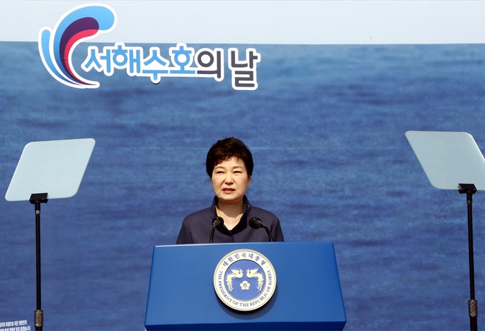 (서울=포커스뉴스) 박근혜 대통령이 25일 오전 국립대전현충원에서 열린 1회 서해수호의 날 기념식에 참석해 기념사를 하고 있다. <사진제공=국가보훈처>
