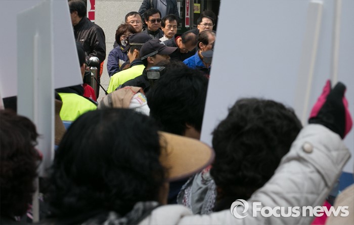 (서울=포커스뉴스) 김무성 새누리당 대표가 당 공천관리위원회의 결정에 반발해 유승민 의원 등 지역구 6곳에 대해 무공천을 선언해 갈등이 이어지고 있는 25일 오후 서울 여의도 당사 앞에서 김 대표의 결정에 반대하는 시민단체와 김 대표 지지자들이 각각 집회를 하고 있다.