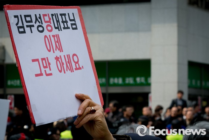 (서울=포커스뉴스) 김무성 새누리당 대표가 당 공천관리위원회의 결정에 반발해 유승민 의원 등 지역구 6곳에 대해 무공천을 선언해 갈등이 이어지고 있는 25일 오후 서울 여의도 당사 앞에서 김 대표의 결정에 반대하는 시민단체와 김 대표 지지자들이 각각 집회를 하고 있다.