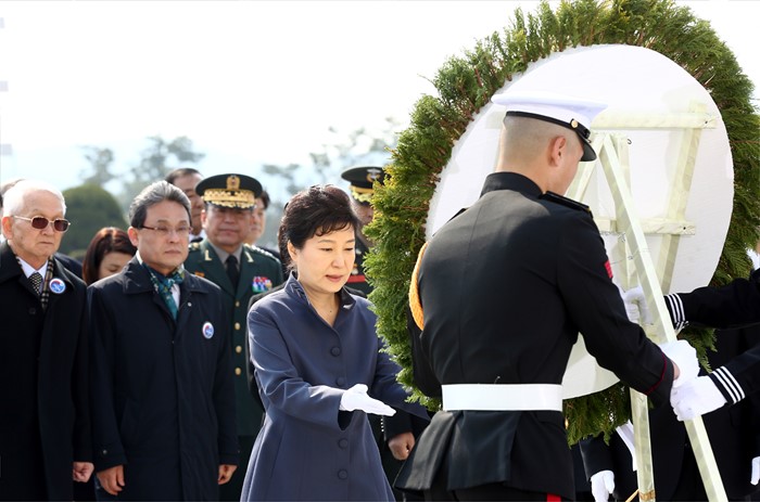 서해 수호의 날은 3월 넷째주 금요일로 서해를 수호하다 목숨을 바친 호국영웅을 기리기 위한 날이다. 정부는 제2 연평해전·천안함 피격·연평도 포격도발 등을 기억하기 위해 서해 수호의 날을 법정기념일로 제정했다.박근혜 대통령이 25일 오전 국립대전현충원에서 열린 1회 서해수호의 날 기념식에 참석해 헌화를 하고 있다. <사진제공=국가보훈처> 2016.03.25 포커스포토