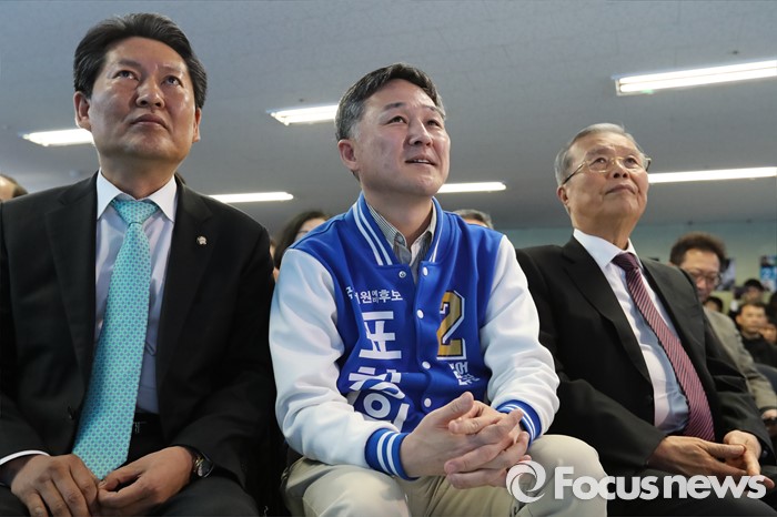 (용인=포커스뉴스) 김종인(오른쪽) 더불어민주당 비대위 대표가 25일 오후 경기도 용인시 표창원 후보 선거사무소 개소식에 참석하고 있다. 오른쪽부터 김종인 대표, 표 후보, 정청래 의원