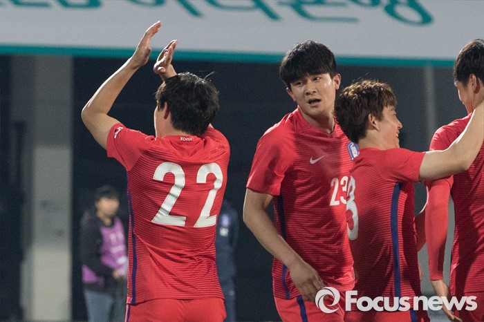 (이천=포커스뉴스) 25일 오후 경기 이천종합운동장에서 열린 KEB하나은행 초청 올림픽대표 대한민국과 알제리의 친선경기에서 전반전 한국 권창훈이 첫 득점을 성공하자 동료들과 기뻐하고 있다.