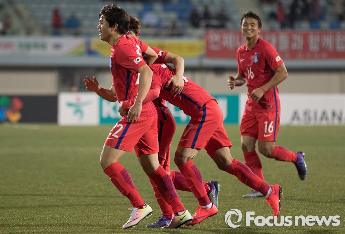 (이천=포커스뉴스) 25일 오후 경기 이천종합운동장에서 열린 KEB하나은행 초청 올림픽대표 대한민국과 알제리의 친선경기에서 전반전 한국 문창진이 두번째 골을 성공하자 동료들과 기뻐하고 있다.