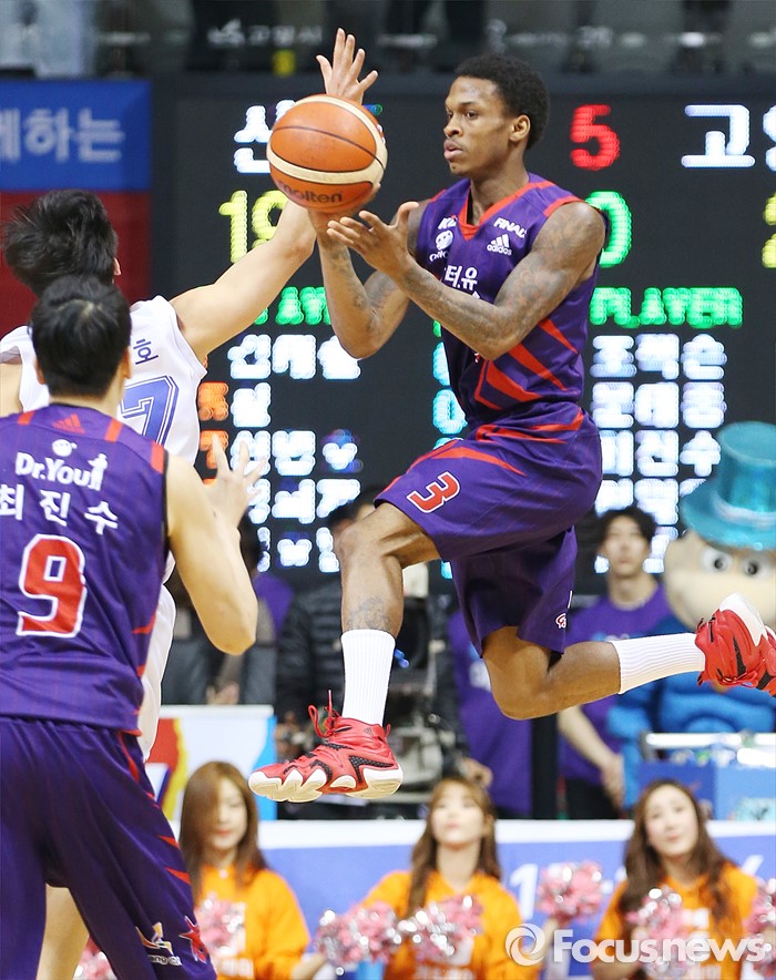 (고양=포커스뉴스) 25일 고양체육관에서 열린 2015-2016 프로농구 챔피언결정전 4차전 오리온-KCC경기에서 오리온 조 잭슨이 KCC 신명호의 마크를 피해 점프하며 최진수에게 패스하고 있다.