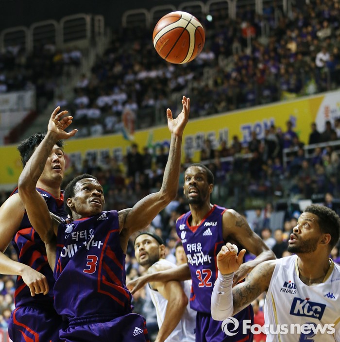 (고양=포커스뉴스) 25일 고양체육관에서 열린 2015-2016 프로농구 챔피언결정전 4차전 오리온-KCC경기에서 오리온 조 잭슨과 KCC 에밋이 바운드된 볼을 바라보고 있다.