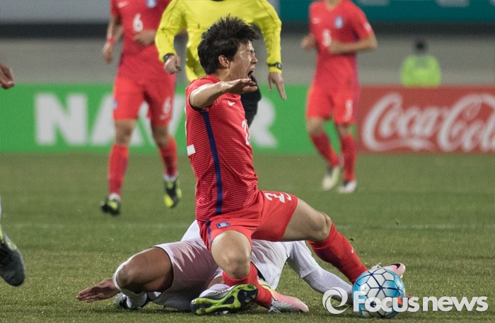 (이천=포커스뉴스) 25일 오후 경기 이천종합운동장에서 열린 KEB하나은행 초청 올림픽대표 대한민국과 알제리의 친선경기에서 후반전 한국 권창훈이 상대선수에게 태클을 당하고 있다.