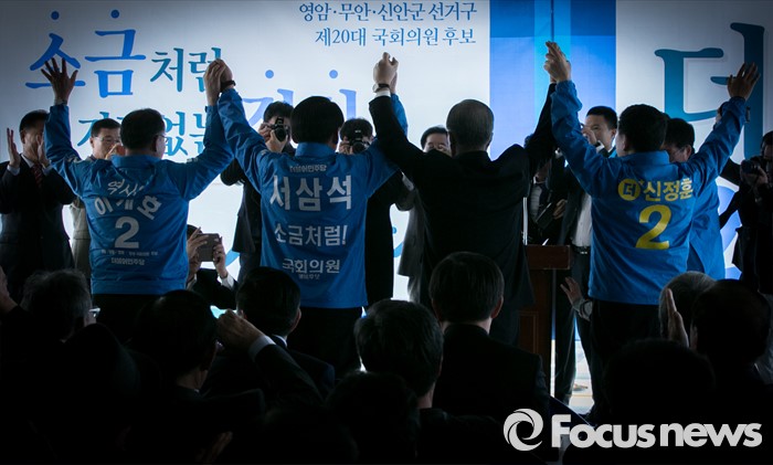(무안=포커스뉴스) 26일 오후 전남 무안군에서 열린 서삼석 더불어민주당 전남 영암·무안·신안군 후보 선거사무소 개소식에 참석한 김종인 비대위 대표와 내빈들이 취재진을 향해 포즈를 취하고 있다. 왼쪽부터 이개호 의원, 서 후보, 김 대표, 신정훈 의원.
