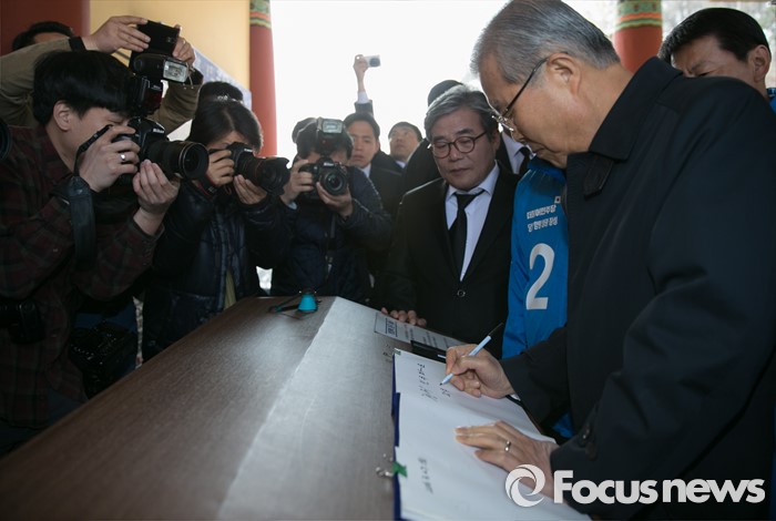 (광주=포커스뉴스) 김종인 더불어민주당 비대위 대표가 27일 오전 광주 북구 국립5·18민주묘지를 방문해 방명록을 작성하고 있다.
