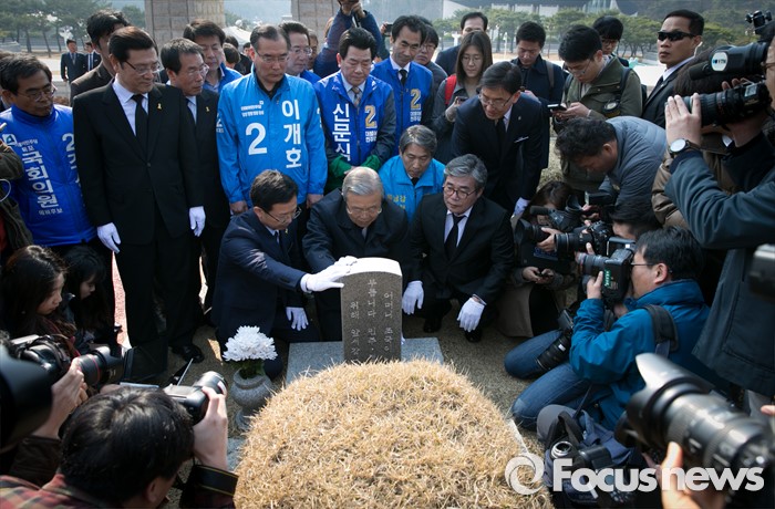 | △ 열사 묘역 앞 무릎 꿇은 김종인 비대위 대표 |