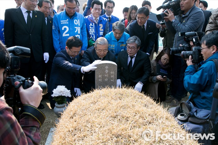 (광주=포커스뉴스) 김종인 더불어민주당 비대위 대표가 20대 총선 전남 및 광주지역 후보들과 함께 27일 오전 광주 북구 국립5·18민주묘지를 방문해 전영진 열사 묘역 참배를 하고 있다.