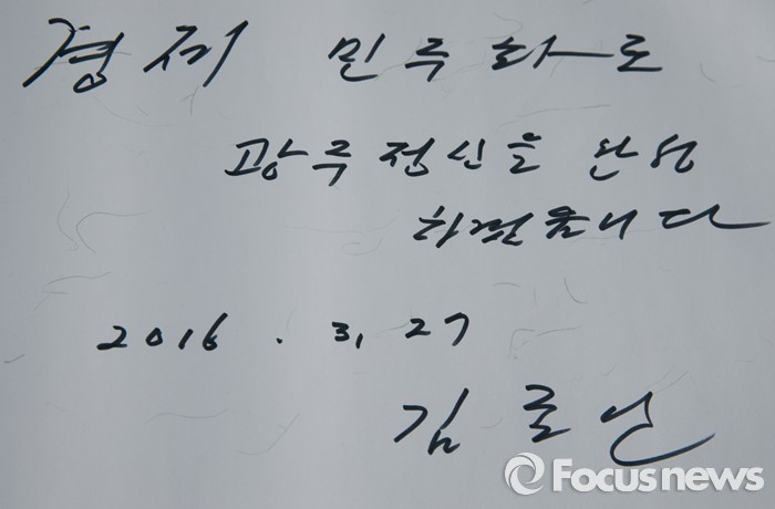 (광주=포커스뉴스) 김종인 더불어민주당 비대위 대표가 20대 총선 전남 및 광주지역 후보들과 함께 27일 오전 광주 북구 국립5·18민주묘지를 방문해 참배했다. 사진은 김 대표가 작성한 방명록.