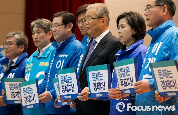 (광주=포커스뉴스) 김종인 더불어민주당 비대위 대표가 27일 오전 광주 서구 김대중컨벤션센터에서 열린 더불어민주당 경제살리기 광주·전남 20대 총선 후보자 연석회의에 참석해 후보자들과 피켓을 들고 퍼포먼스를 하고 있다.