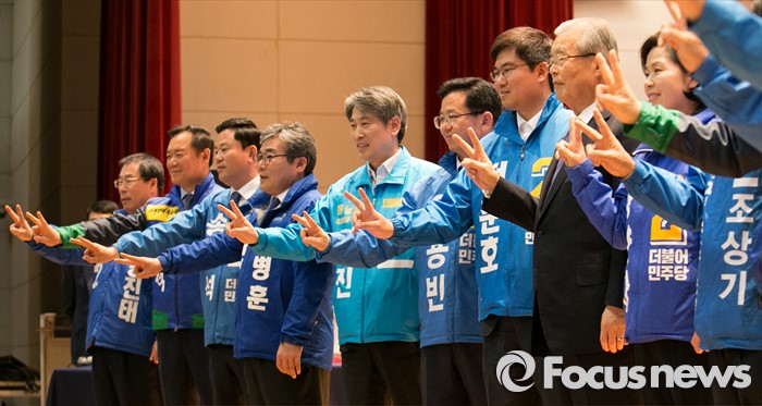 (광주=포커스뉴스) 김종인(오른쪽 세번째) 더불어민주당 비대위 대표가 27일 오전 광주 서구 김대중컨벤션센터에서 더불어민주당 경제살리기 광주·전남 20대 총선 후보자 연석회의를 마친 뒤 후보들과 함께 기호 2번을 상징하는 브이 포즈를 취하고 있다.