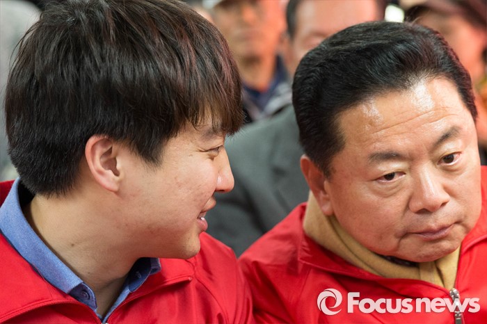 (서울=포커스뉴스) 이준석 새누리당 서울 노원병 후보가 27일 오후 서울 노원구 자신의 선거사무소 개소식에서 구상찬 후보와 이야기를 나누고 있다.