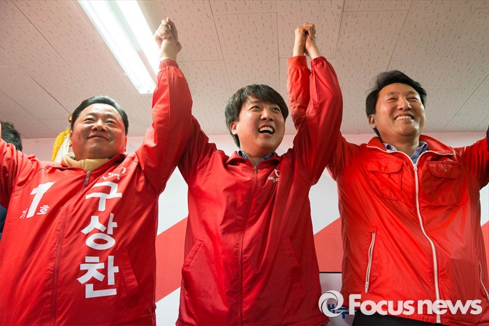 (서울=포커스뉴스) 이준석(가운데) 새누리당 서울 노원병 후보가 27일 오후 서울 노원구 자신의 선거사무소 개소식에서 구상찬(왼쪽), 오세훈 후보와 만세를 외치고 있다.