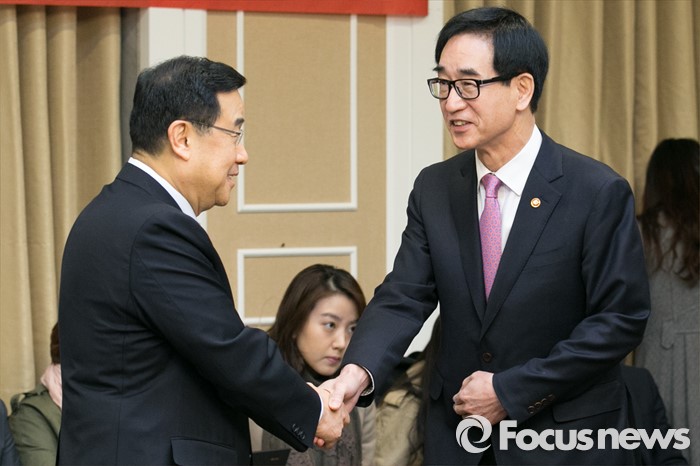 (서울=포커스뉴스) 김정훈(왼쪽) 새누리당 정책위의장과 이준식 사회부총리 겸 교육부 장관이 28일 오전 서울 여의도 국회에서 열린 누리과정 등 교육현안 관련 당정협의에 참석해 악수하고 있다.