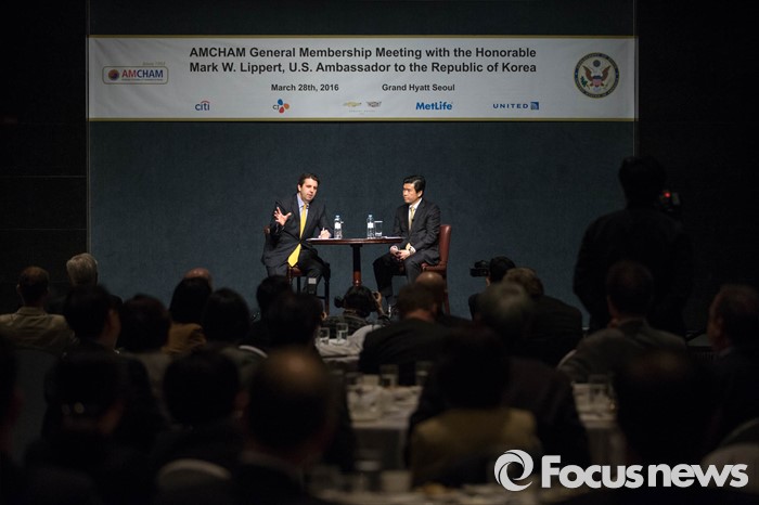 (서울=포커스뉴스) 마크 리퍼트 주한미국대사가 28일 오전 서울 용산구 그랜드하얏트 호텔에서 열린 '주한미국대사와의 오찬 간담회'에 참석, 한 취재진의 질문에 답변하고 있다.