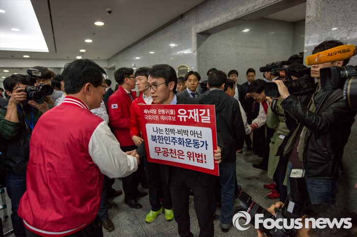 (서울=포커스뉴스) 새누리당의 무공천 결정으로 4.13 총선 서울 은평을 출마가 무산된 유재길 예비후보가 28일 오후 20대 총선 새누리당 공천자대회가 열리는 서울 영등포구 국회 의원회관에서 피켓 시위를 벌이고 있다.