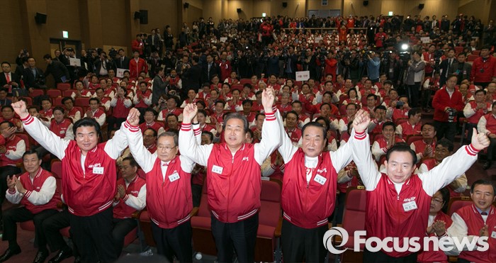 (서울=포커스뉴스) 28일 오후 서울 여의도 국회 의원회관에서 열린 새누리당 20대 총선 공천자대회에 참석한 공동선대위원장들이 손을 드어 포즈를 취하고 있다. 오른쪽부터 이인제, 서청원, 김무성, 강봉균, 원유철 위원장.
