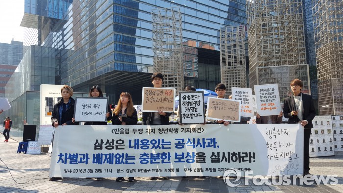 올해 1월에는 '백혈병 등 질환 발병 문제 해결을 위한 조정위원회'를 열어 사과, 보상, 재발방지대책 등 조정 3의제 중 재발방지대책에 관해 최종 합의했다.(서울=포커스뉴스) 청년 학생 단체가 28일 서울 서초구 강남역 8번 출구 앞에서 '반올림' 투쟁을 지지하는 기자회견을 열었다. 2016.03.28 정상훈 기자