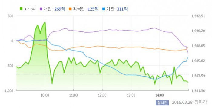 이날 코스피는 전거래일 대비 1.12포인트 오른 1984.93에 장을 시작했다. 이후 지수는 강보합 흐름을 나타냈다. 그러나 오후 들어 외국인과 기관의 매도 공세에 약보합세로 전환했다.