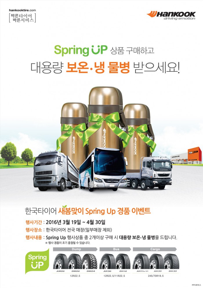 (서울=포커스뉴스) 한국타이어가 다음달 30일까지 트럭버스용 타이어 2개 이상을 구매한 고객에게 대용량 보온·냉 물병을 증정하는 '스프링 업(Spring Up) 경품 이벤트'를 진행한다고 28일 밝혔다.