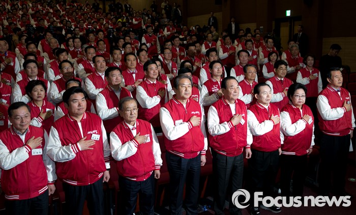 (서울=포커스뉴스) 28일 오후 서울 여의도 국회 의원회관에서 열린 새누리당 20대 총선 공천자대회에 참석한 김무성, 원유철, 강봉균, 서청원, 이인제 공동선대위원장 등 지도부 및 후보들이 국기에 대한 경례를 하고 있다.