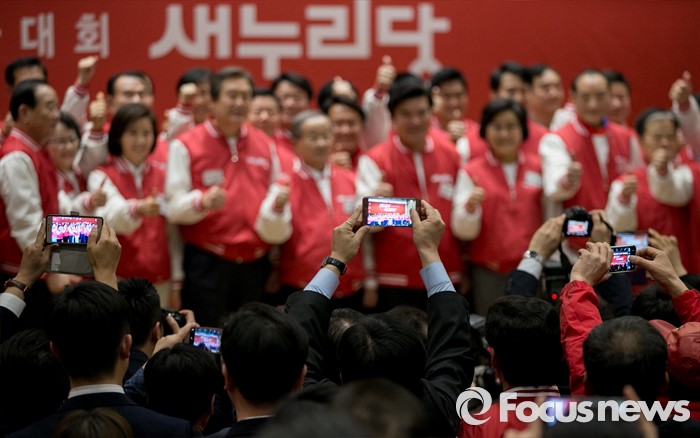 (서울=포커스뉴스) 28일 오후 서울 여의도 국회 의원회관에서 열린 새누리당 20대 총선 공천자대회에 참석자들이 김무성 공동선대위원장 등 지도부와 서울지역 후보들의 기념촬영을 모습을 촬영하고 있다.