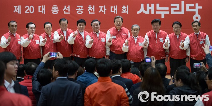 (서울=포커스뉴스) 28일 오후 서울 여의도 국회 의원회관에서 열린 새누리당 20대 총선 공천자대회에 참석한 울산 지역 후보들과 지도부가 기념촬영을 하고 있다.