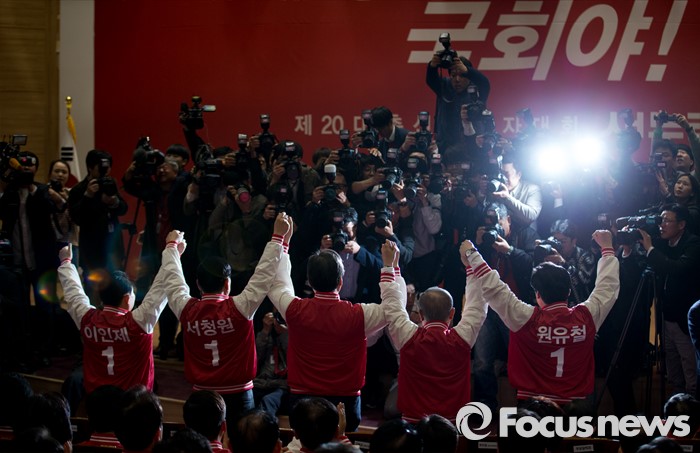 (서울=포커스뉴스) 28일 오후 서울 여의도 국회 의원회관에서 열린 새누리당 20대 총선 공천자대회에 참석한 이인제(왼쪽부터), 서청원, 김무성, 강봉균, 원유철 공동선대위원이 손을 들어 취재진을 향해 포즈를 취하고 있다.