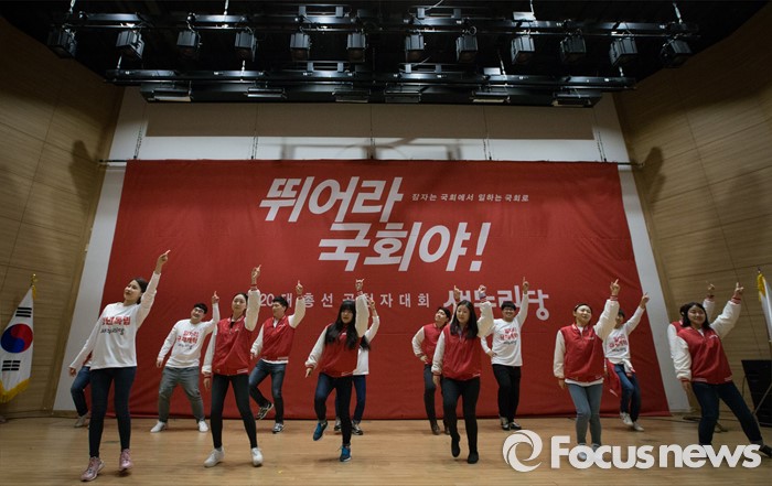 (서울=포커스뉴스) 28일 오후 서울 여의도 국회 의원회관에서 열린 새누리당 20대 총선 공천자대회에 참석한 청소년서포터즈가 선거 율동을 선보이고 있다.