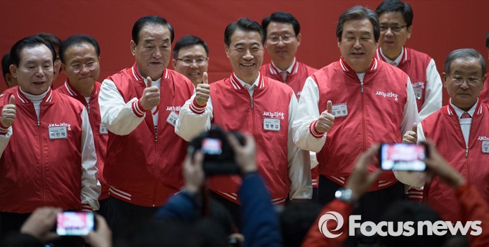 (서울=포커스뉴스) 28일 오후 서울 여의도 국회 의원회관에서 열린 새누리당 20대 총선 공천자대회에 참석한 정종섭 대구 동구갑 후보와 공동선대위원장들이 기념촬영을 하고 있다. 왼쪽부터 이인제, 서청원, 정 후보, 김무성, 강봉균 선대위원장.