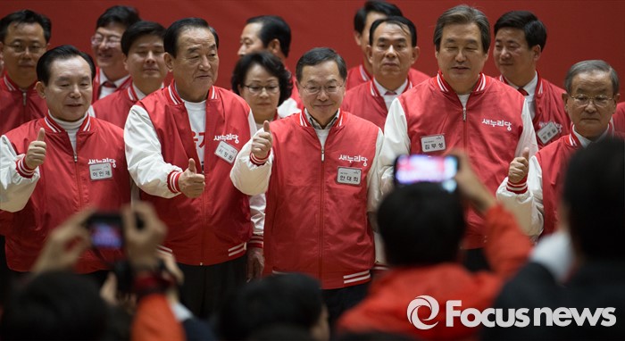 (서울=포커스뉴스) 28일 오후 서울 여의도 국회 의원회관에서 열린 새누리당 20대 총선 공천자대회에 참석한 안대희 서울 마포갑 후보와 공동선대위원장이 기념촬영을 하고 있다. 오른쪽부터 강봉균, 김무성 위원장, 안 후보, 서청원, 이인제 위원장.