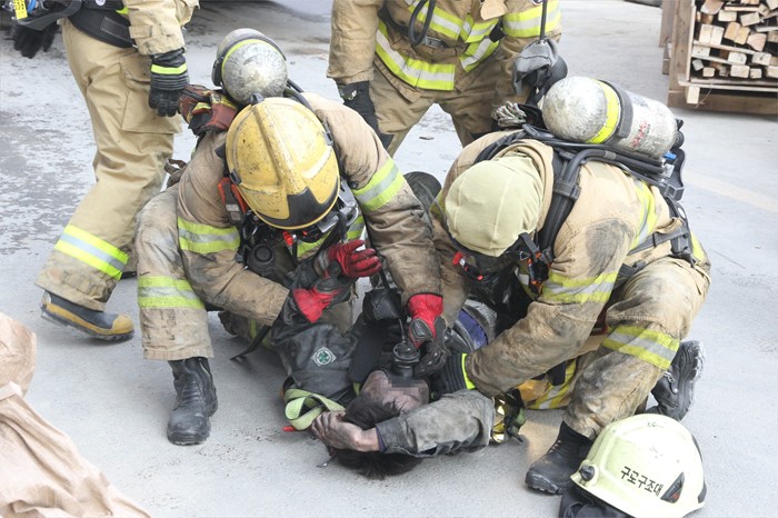 (서울=포커스뉴스) 28일 오후 서울 강서구 마곡동 한 오피스텔 공사장에서 화재가 발생, 강서소방서 대원들이 현장에 있던 근로자들을 구조하고 있다. <사진제공=강서소방서>