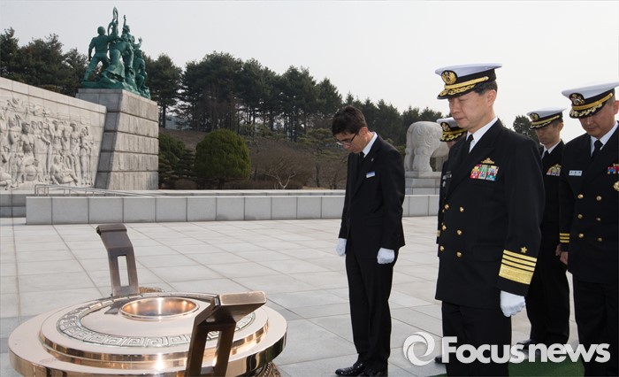 (대전=포커스뉴스) 다케이 도모히사 일본 해상막료장(해군참모총장)이 29일 오전 대전 유성구 국립대전현충원을 방문, 현충탑에서 참배를 하고 있다.