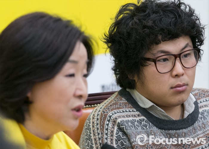(서울=포커스뉴스) 29일 오전 서울 여의도 국회에서 열린 정의당-중식이밴드 2016 총선 공식 테마송 협약식에 참석한 중식이밴드의 보컬 정중식(오른쪽)이 심상정 상임선대위원장의 인사말을 듣고 있다.