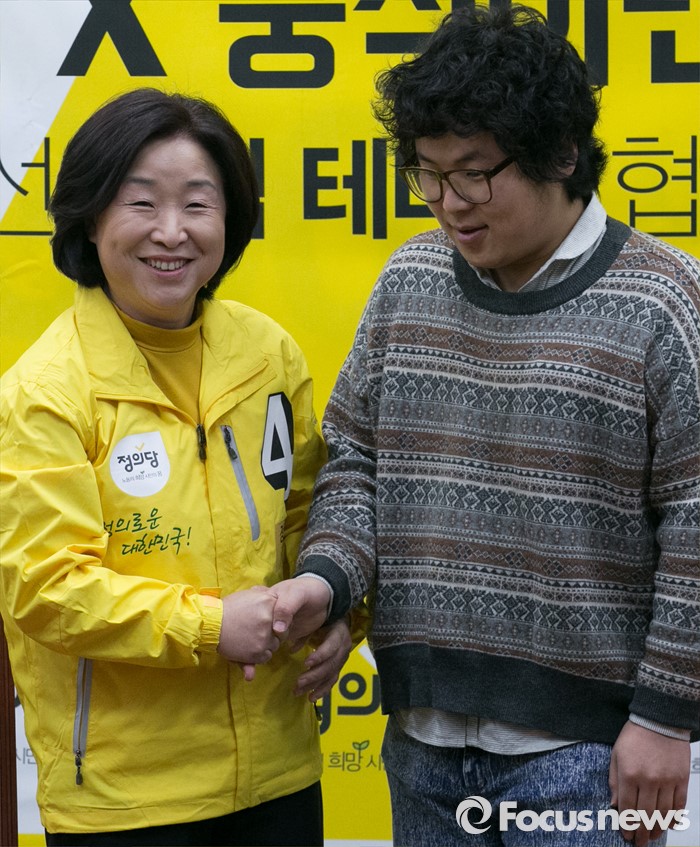 (서울=포커스뉴스) 29일 오전 서울 여의도 국회에서 열린 정의당-중식이밴드 2016 총선 공식 테마송 협약식에 참석한 심상정(왼쪽) 상임선대위원장과 중식이밴드의 보컬 정중식이 인사하고 있다.
