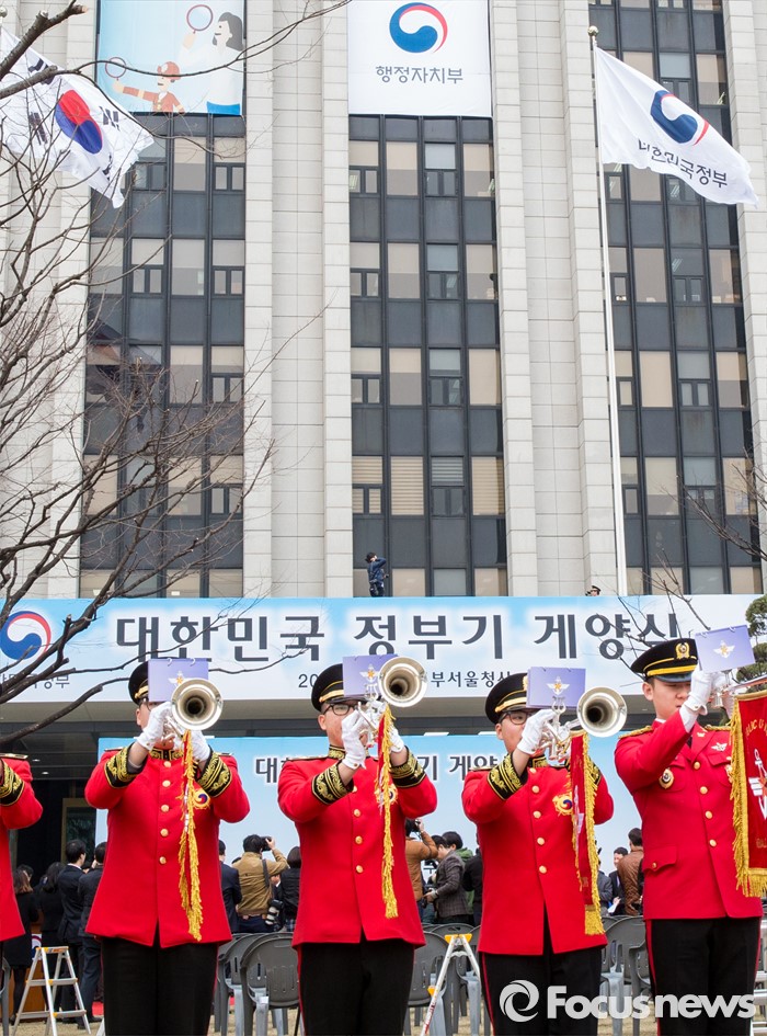 (서울=포커스뉴스) 29일 오전 서울 종로구 정부서울청사에서 대한민국 정부기 게양식이 열렸다. 이날 행사에 참석한 해병대 군악대가 새 정부기 게양을 축하하고 있다. 정부는 67년간 사용해온 '무궁화'에서 '태극' 도안으로 바뀐 새 정부기를 정부세종청사와 서울청사 등 10개 청사에 게양했다.