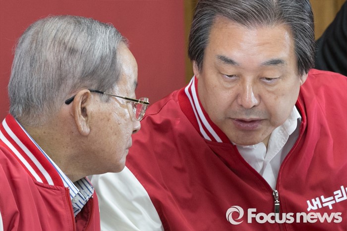 (서울=포커스뉴스) 김무성(오른쪽) 새누리당 대표와 강봉균 공동 중앙선대위원장이 29일 오전 서울 여의도 국회에서 열린 첫 중앙선거대책위원회의에 참석해, 대화하고 있다.