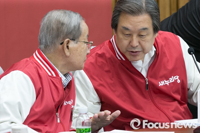(서울=포커스뉴스) 김무성(오른쪽) 새누리당 대표와 강봉균 공동 중앙선대위원장이 29일 오전 서울 여의도 국회에서 열린 첫 중앙선거대책위원회의에 참석해, 대화하고 있다.