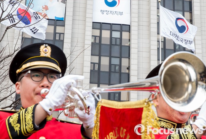 (서울=포커스뉴스) 29일 오전 서울 종로구 정부서울청사에서 대한민국 정부기 게양식이 열렸다. 이날 행사에 참석한 해병대 군악대가 새 정부기 게양을 축하하고 있다. 정부는 67년간 사용해온 '무궁화'에서 '태극' 도안으로 바뀐 새 정부기를 정부세종청사와 서울청사 등 10개 청사에 게양했다.