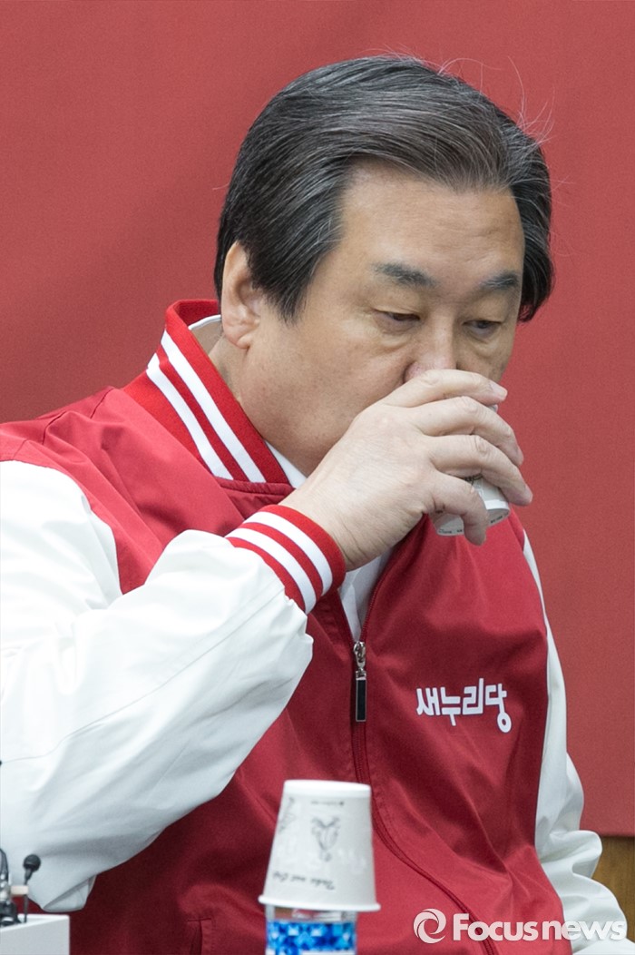(서울=포커스뉴스) 김무성 새누리당 대표가 29일 오전 서울 여의도 국회에서 열린 첫 중앙선거대책위원회의에 참석해, 물을 마시고 있다.