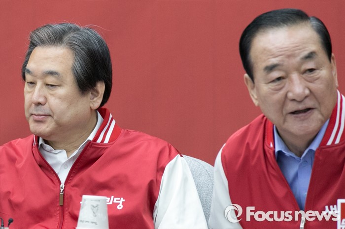 (서울=포커스뉴스) 김무성(왼쪽) 새누리당 대표와 서청원 최고위원이 29일 오전 서울 여의도 국회에서 열린 첫 중앙선거대책위원회의에 참석해, 자리에 앉고 있다.