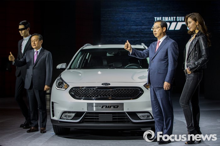 (서울=포커스뉴스) 박한우(오른쪽 두 번째) 기아자동차 사장과 김창식(왼쪽 두 번째) 부사장이 29일 오전 서울 광진구 쉐라톤 그랜드 워커힐에서 기아차 친환경 소형 SUV '니로(NIRO)'를 공개 하고 있다.